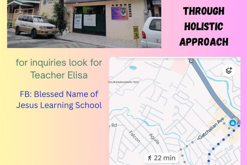 607 Juan Aranda Street, Phase 4 Gatchalian Barangay Manuyo Dos, Subdivision, Las Pinas CityBlessed Name of Jesus Learning School is a private Christian educational institution located at 607 Juan Aranda Street, Phase 4, Gatchalian Subdivision, Manuyo Dos, Las Piñas City. The school is dedicated to providing quality basic education in a nurturing and faith-centered environment, where students are guided to grow academically, morally, and spiritually.